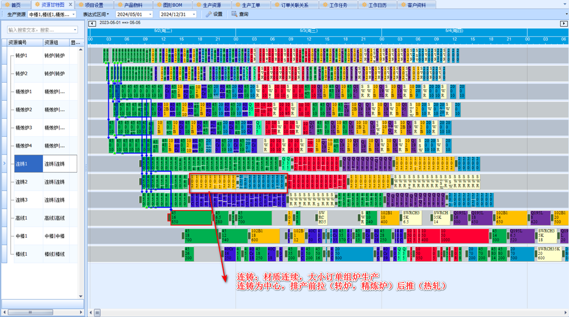 由于各工序的炼铁炉大小不同,每炉的生产时间也有差异,排程时要考虑工序的炉次在时间和容量上的匹配,确保生产的连续性。
